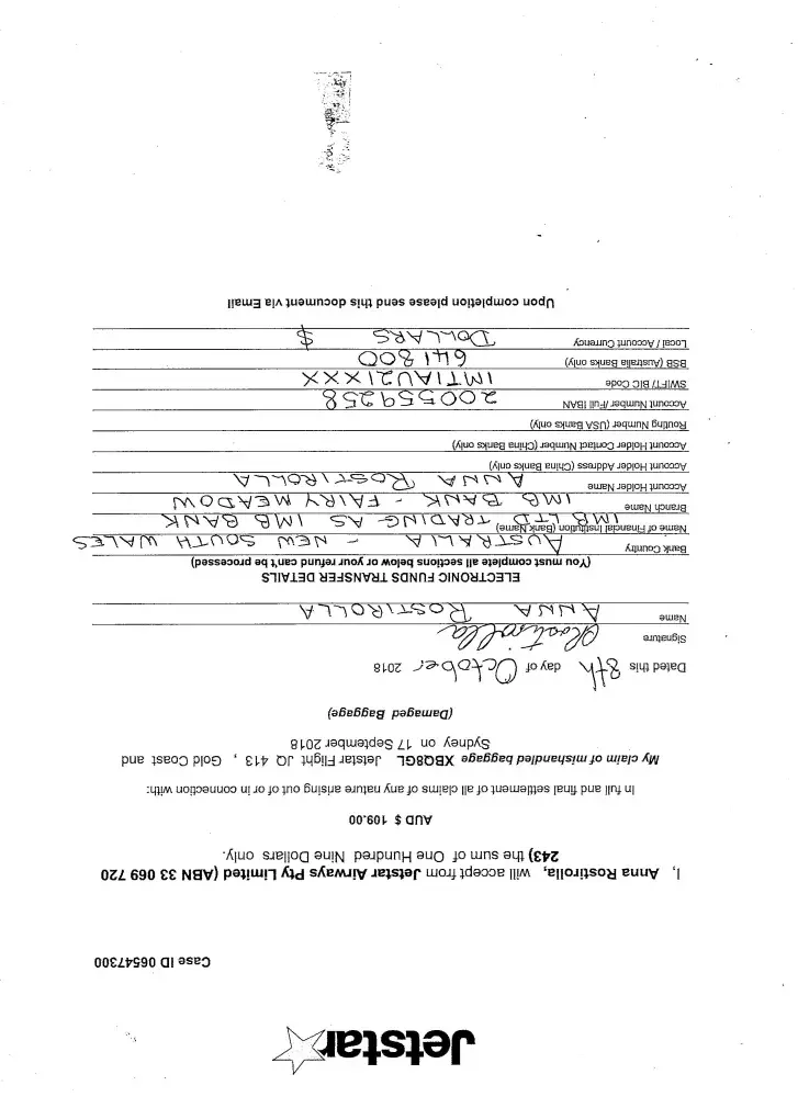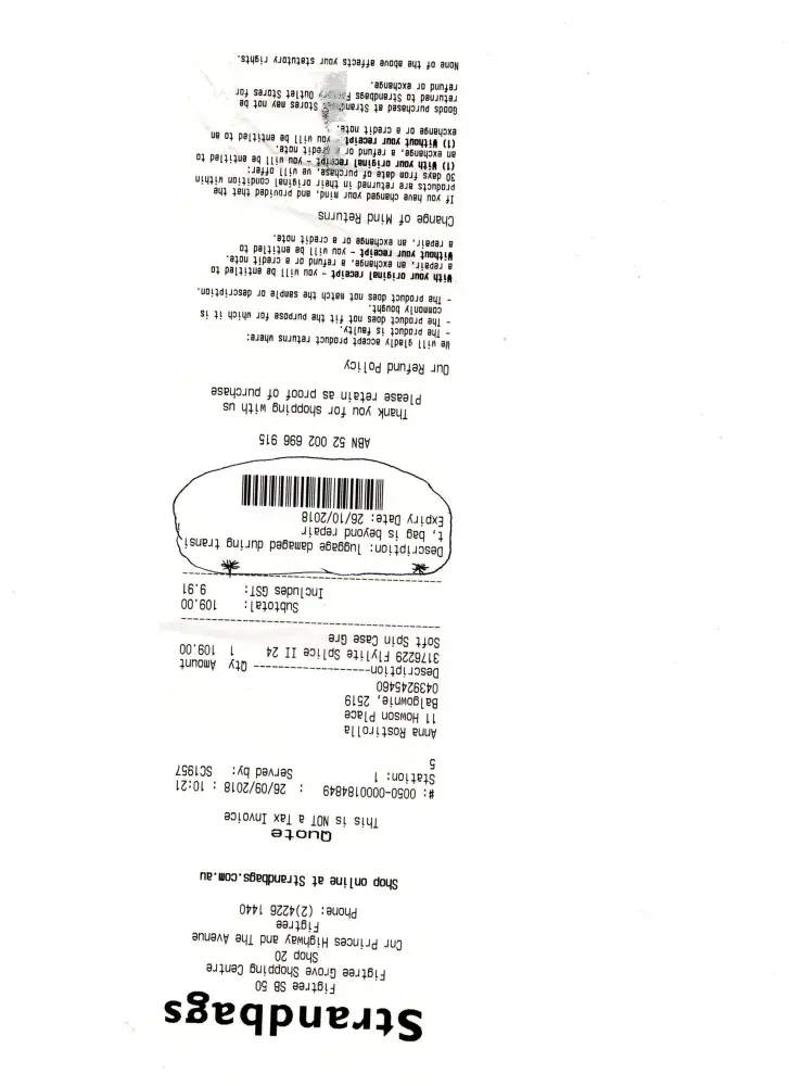 I travelled with Jetstar Airways on 17th September, XBQ8GL from Coolangatta to Sydney. When i collected my brand new suitcase from baggage terminal i noticed 2 tears underneath the suitcase. I have sent in photos of damaged suitcase, completed a claim form and also obtained a statement from the store that the case was purchased from, stating suitcase was unrepairable. I also obtained a quote to replace the same suitcase. All this information was sent to Jetstar Having made many attempts to re submit all information over and over and phone calls, I have been unsuccessful to even hear from them. My claim number is [protected]. I have provided all the information Jetstar Airways have requested including my bank account details but as yet refund of $109.00 for replacement of suitcase has not been forthcoming.