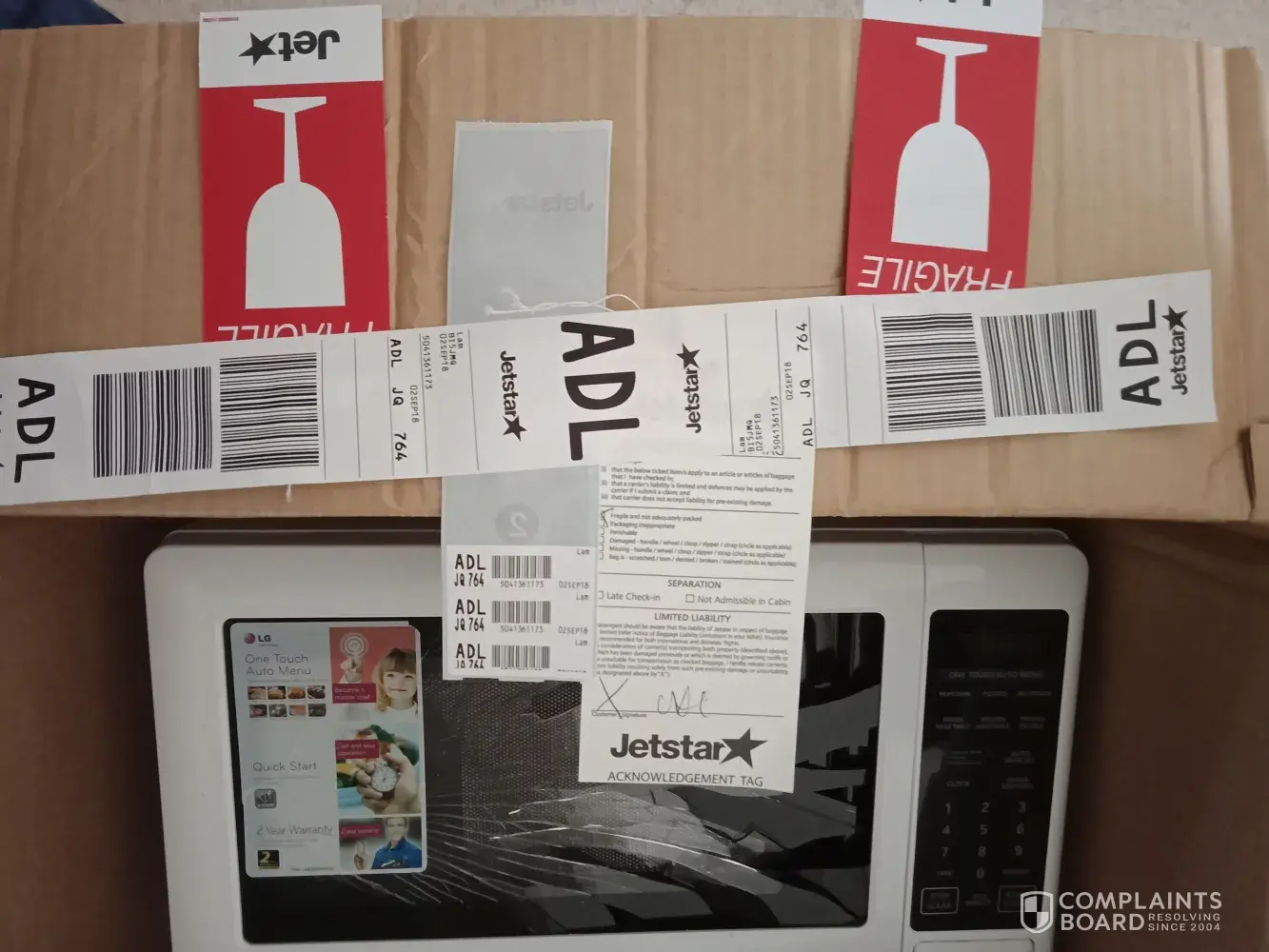 I logged an online complaint straight away, eventhough I didn't think it would go anywhere. I received a reply the next day, asking for a report from the airport. I looked online for answers as I have no idea what the Jetstar officer was asking for as well as replying to the email asking what report they were after. Adelaide airport website says to contact the airline directly, which I did. It was going around in circles and getting no where. I just called the airport for assistance and the gave me the Jetstar direct number that deals with baggage damage. The customer service officer said all electronic items not covered, it's in the policy. I told her it's not about the microwave. I just went out & bought another one today. I was annoyed that my baggage was mishandled.