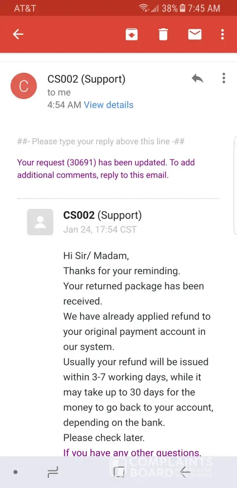 Latest update as of January 23rd, while my tracking number from the post office says they received the package on January 18th, I've yet to receive a refund and when questioned about it they reply that it may take up to 30 days?! I've attached a copy of the email I received from them, BUYER BEWARE, THEY'RE CUSTOMER SERVICE AND REFUND PRACTICES ARE JUST AS SHOTTY AND FAKE AS THEIR MERCHANDISE!
