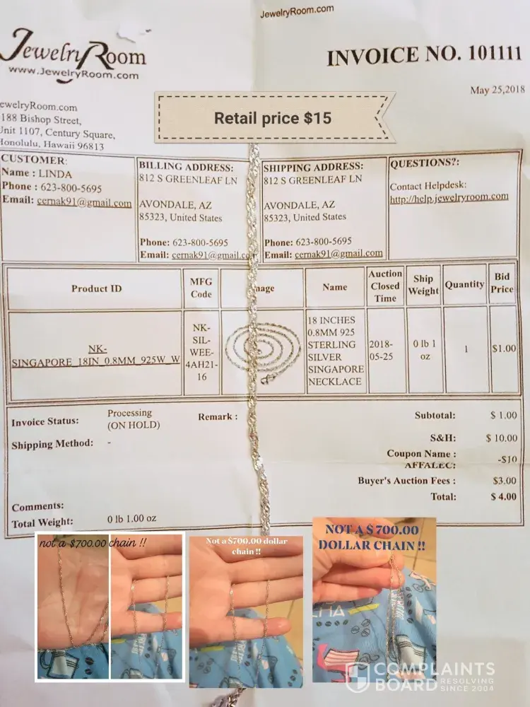 I bidded on a $700.00 sterling silver chain and won the bid. And when I receive this chain I actually started laughing I couldn't believe the gall of these people it was fraudulent advertising oh that item for sale. This chain was no $700 chain I looked it up and priced it for $15 it's pathetic can you can't even get a hold of them they do not get back to you after you submit a ticket.