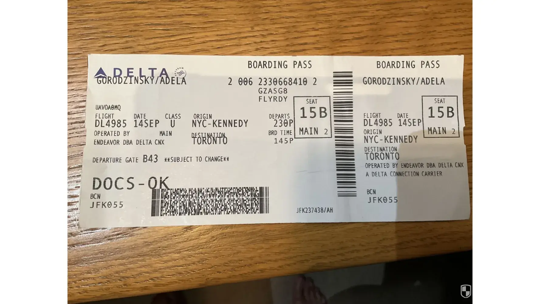 Yesterday, September 14th, 2022, I travelled from JFK to Toronto Pearson's airport. I used Delta Airlines, Flight 4985. The time was approximately 12:15 or 12:30 p.m.