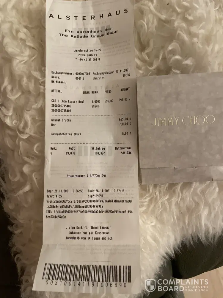 On 26.11.21 I bought the shoes. On 28.11.21 I put them on and on the way I tore the buttons by myself. On 02.12.21 I went to the store, the saleswoman welcomed us very well, and immediately took the problem up. Today on 08.01.22 I went to the store and he told me that last night they came we were late until the button came. I bought them with such pleasure for the end-of-year holidays that I did not wear them for the holidays, nor do I buy them anymore in Jimmy Choo. I do not intend to wear shoes 695.00 € repaired at the shoemaker.