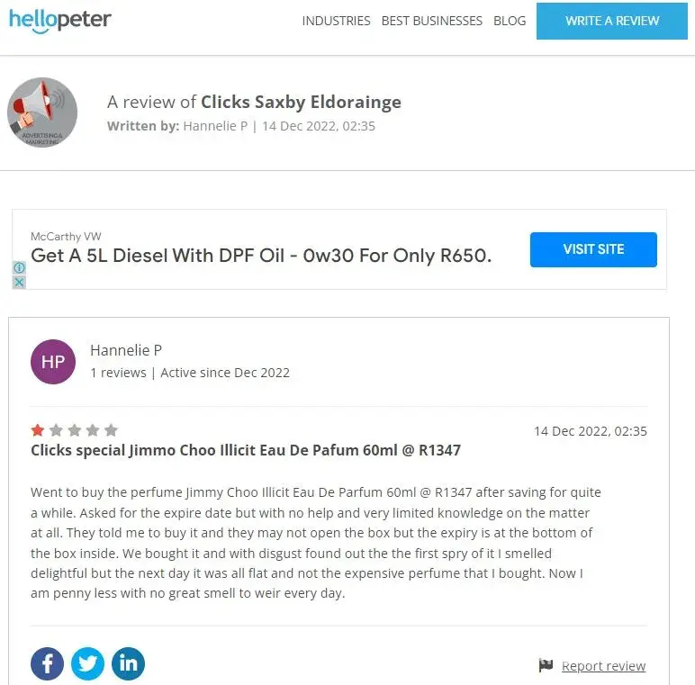 Went to buy the perfume Jimmy Choo Illicit Eau De Parfum 60ml @ R1347 after saving for quite a while. Asked for the expire date but with no help and very limited knowledge on the matter at all. They told me to buy it first before they can look at the expiry date on the bottom of the box inside. We bought it and with disgust found out that there were was no expiry date. I then learned on Google that they go by Batch numbers that you can check online. Illicit was manufactured in 2015 and I was told that after opening it will last for 3 years. The first spry of it smelled delightful but the next day it was all flat and not the expensive perfume that I bought. Now I am penny less with no great smell to weir every day. A long time of savings money is right down the drain, very disappointed and reported to Hello Peter to warn other woman.