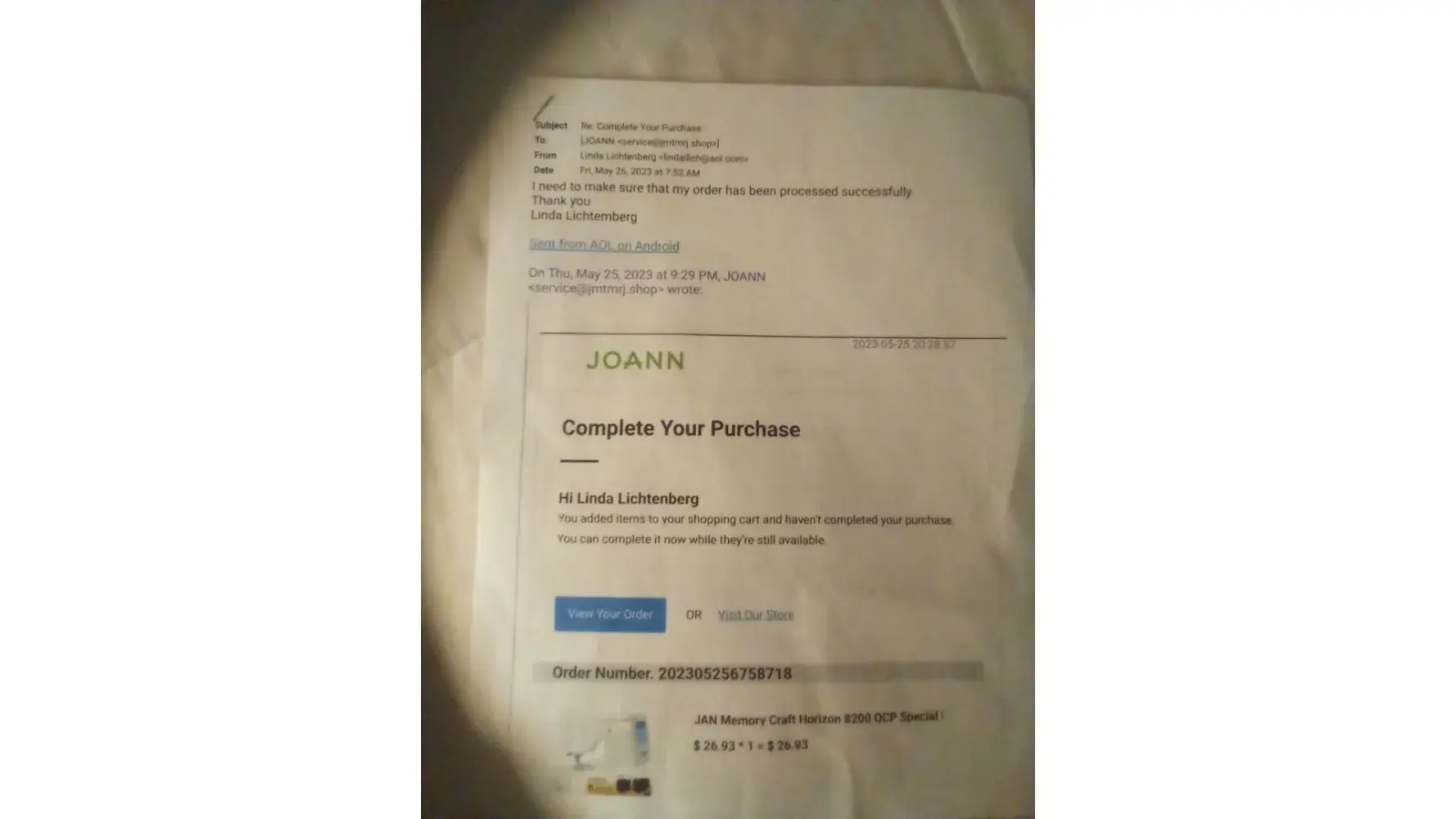 I told her that I was looking at the item online on their Jo-Ann Fabrics website, and it showed that the item was still in stock. However, the customer service woman hung up on me. I was extremely disappointed and frustrated with the way I was treated. I attached my confirmation email and another picture showing that they had my item in stock, but yet, they canceled my order with no explanation whatsoever.