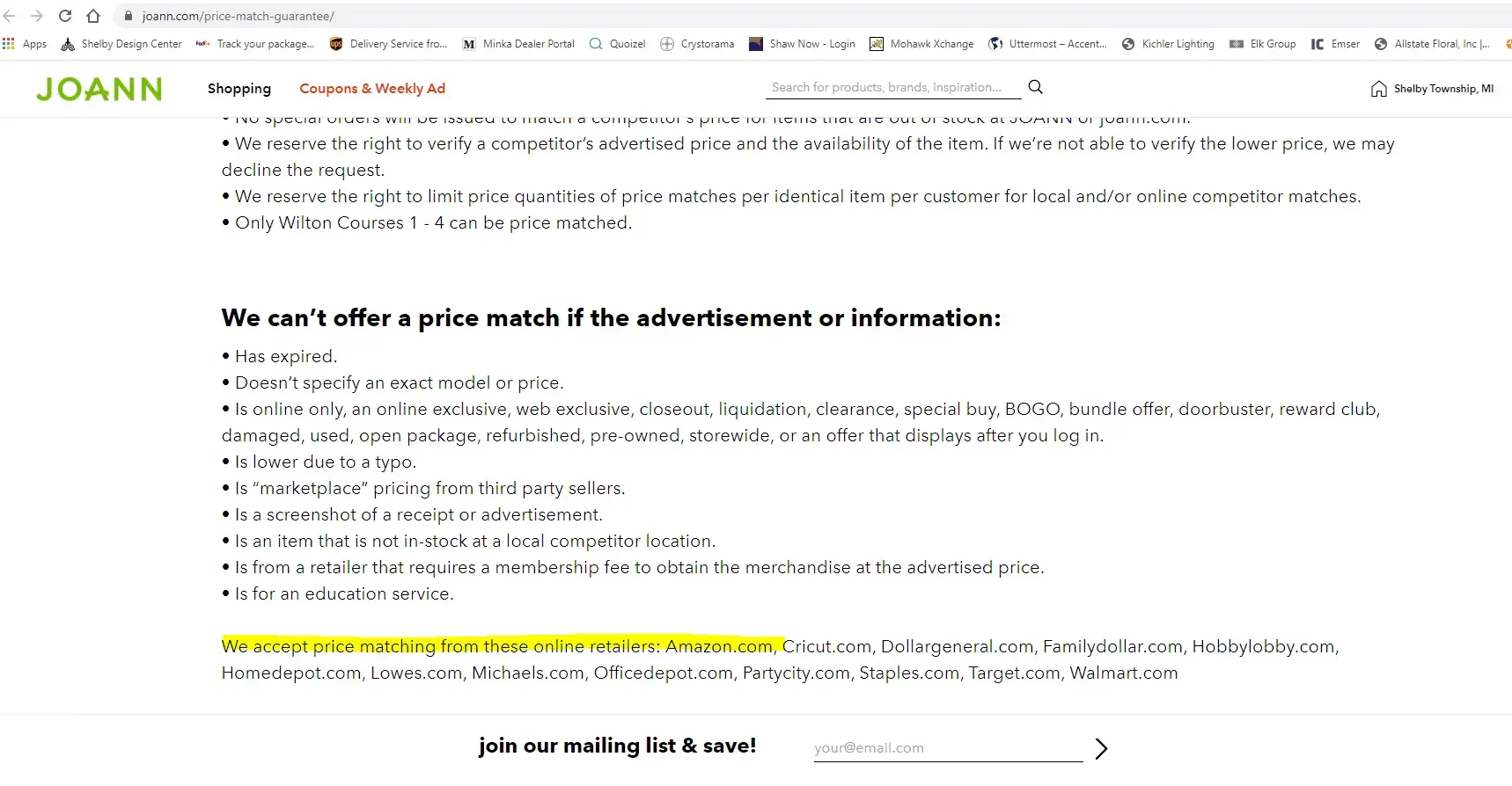 I purchased a Cricut on 5/10/21. I found this same product online at Amazon for $329 in stock. I sent all of this information to customer service and they said they do not price match Amazon. But, on your website it clearly states that you price match certain online vendors and Amazon is listed as your first. I would like and explanation as to why I am not able to get a price match. I was told in 2 separate emails that it is because you cannot walk into a Amazon store to shop but if that is the case it should not be on the website that you price match online vendors and then list them.