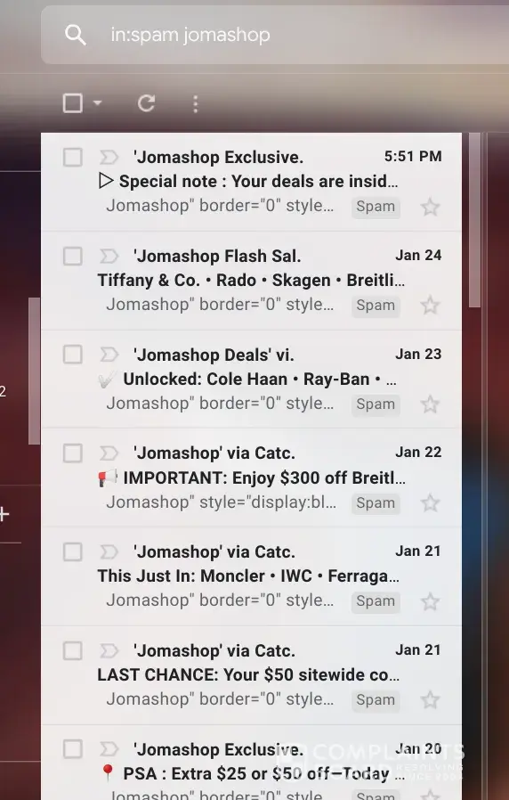 The spam sent from Jomashop.com is appalling. You can click unsubscribe using the link in their spam email but unfortunately, it doesn't actually unsubscribe you. They have even found ways to bypass my Gmail spam filter. You will get craploads of spam from these guys and won't be able to stop it! I have tried to get this resolved multiple times. I have called customer service but their hold times are also ridiculous. Beware!