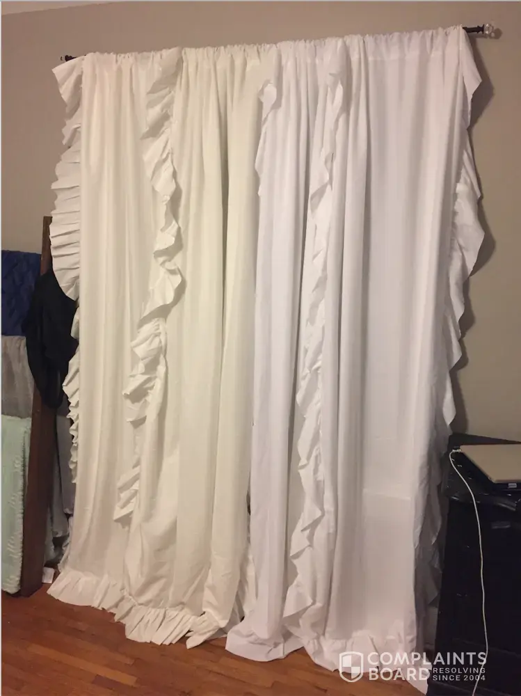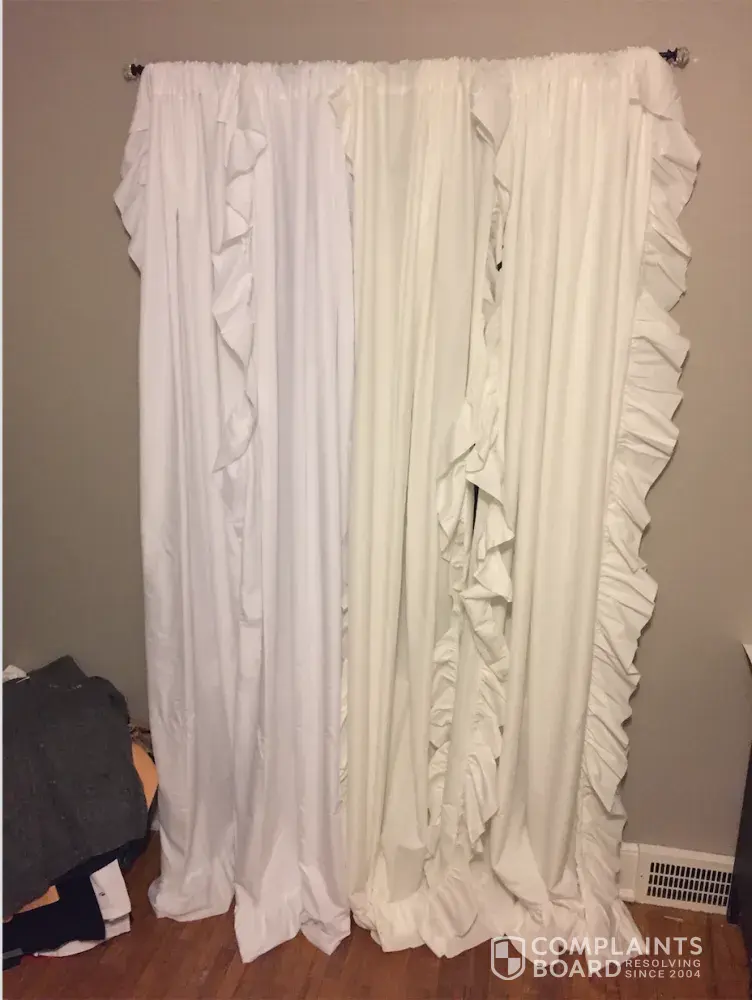 I had originally ordered two sets of the white Evelyn Curtain Panels (order #[protected]) on May 26, 2017. After hanging the sets I decided two more panels one each window would look best, so I ordered two more sets of the same curtains (order #[protected]) on July 9, 2017. After hanging the second sets, I realized they are not the same color or material.