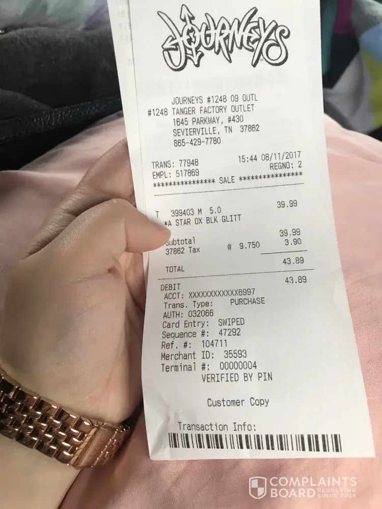 I've visited Journey's recently and I only wanted to buy shoes. The woman offered to give me shoe cleaner, and I declined 3 times. She kept hounding me until I said yes and made my purchase very uncomfortable. Although she offered the item at a discount I did not want it at all. She still insisted on trying to sell it. I want my money back and from now on I'll be ordering shoes either offline or when she's not in the store.