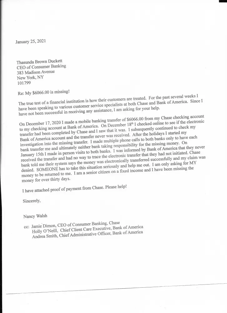 I initiated a transfer from my checking account with Chase Bank to my checking account at Bank of America on 12/17/20 for the amount of $6066.00. I have made numerous phone calls to both banks and been transferred to many different departments for the last several weeks. Neither bank will help me. Chase says it was successfully electronically transferred and Bank of America says the transfer was never received. I filed a "dispute" and was notified that their records show the transfer was sent on 12/18/20 and they had no way to research it. As of today I still do not have my money and have not received any advice on how to get it back.
