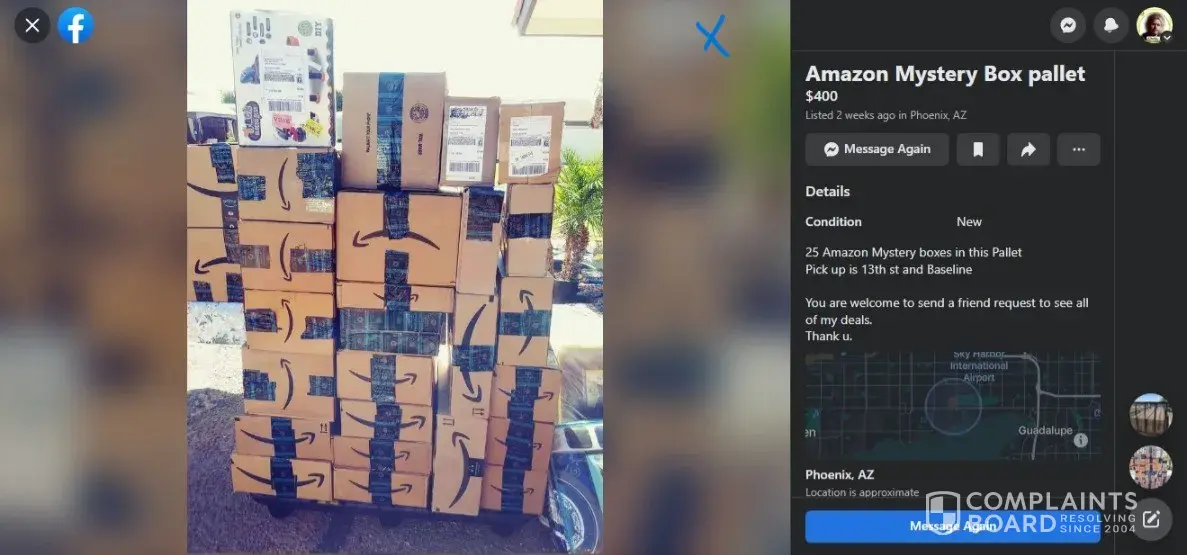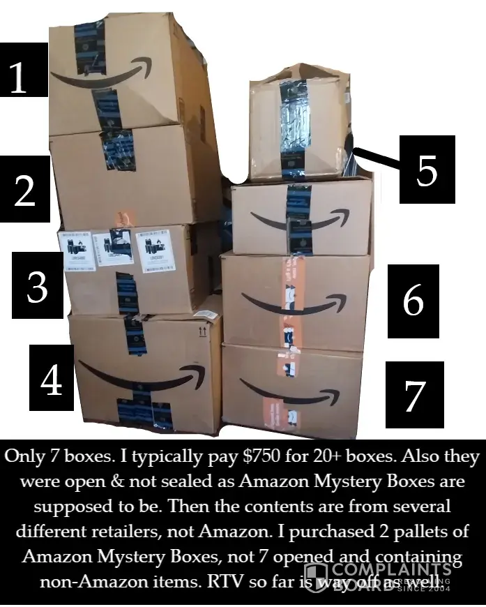 Photos 1 is what I actually ended up with when I placed the several small boxes into the actual Amazon Mystery Boxes. 2-4 is my messages to seller requesting answers and stating these are not Mystery Boxes & tampered with. 5-6 is the ad seller posted. 6 is what I was suppose to receive it was one pallet, for $400, I bought 2 of these but never received the second pallet. 7-9 are the boxes that are tampered with and resealed. Photo 10 is what actual Amazon Mystery Boxes look like.