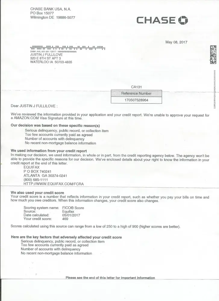 I have lived here for over 10 years and no one in any of the 3 apts has ever lived here with that name. Equifax said it was a fraud & be sure to let bot Chase & Amazon know this.