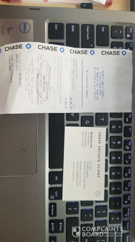 Twelve days from the incident, no one contacts me to solve the problem. I went to the Chase on May 14, 2021, at 2:00 PM. Here, there are two facts that make me believe that the staff here work unprofessionally and irresponsibly.