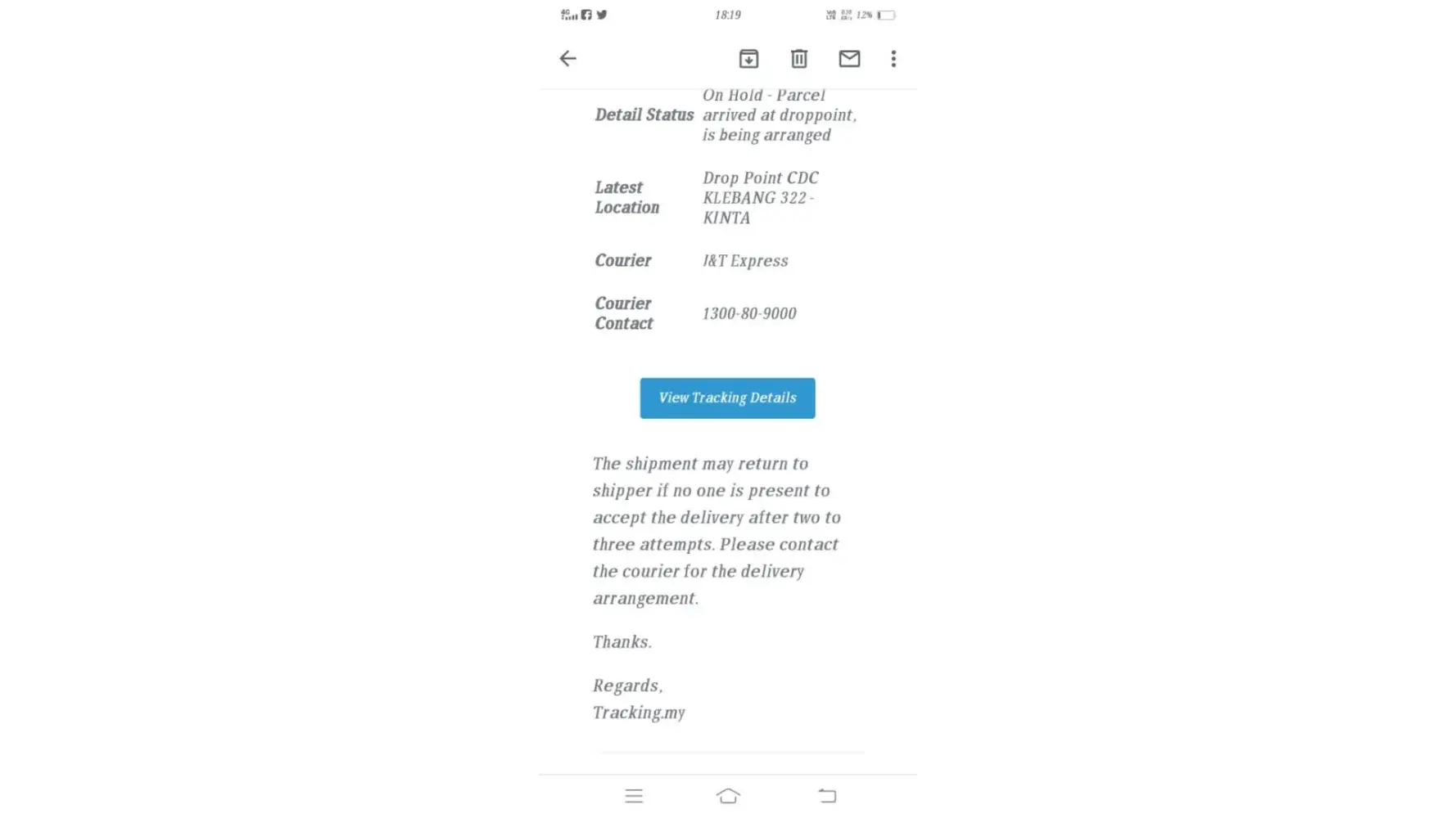 This is not 1st time this happening... They didn't attempt for delivery but always they said they did ... They don't even call .. but at the same time Im at my house there's nobody come for delivery... What the hell... Worst service ever...CDC 322 klebang (J&T) always doing this and when I call them they didn't attend the call ...I called more than 20 times ... Check their rating on google maps ... The comments can say who they are... I hope u guys will take action...