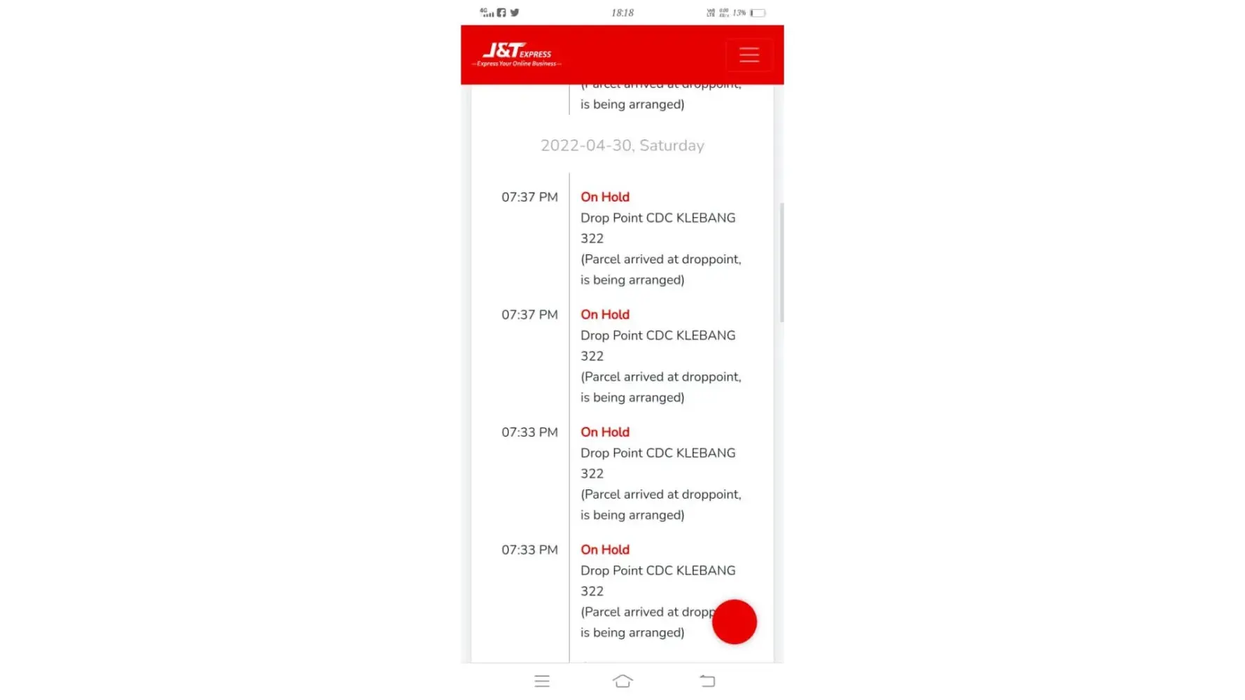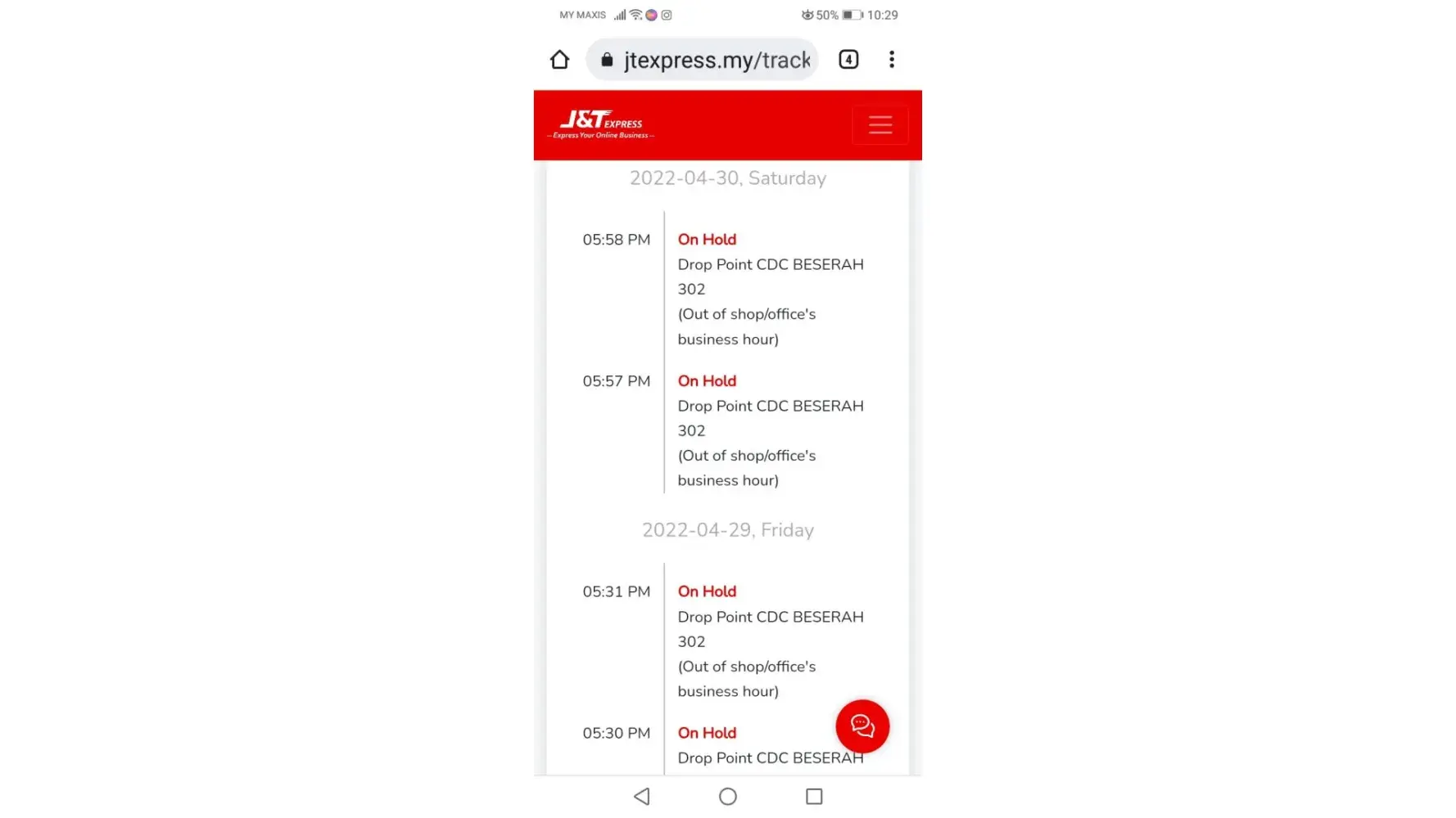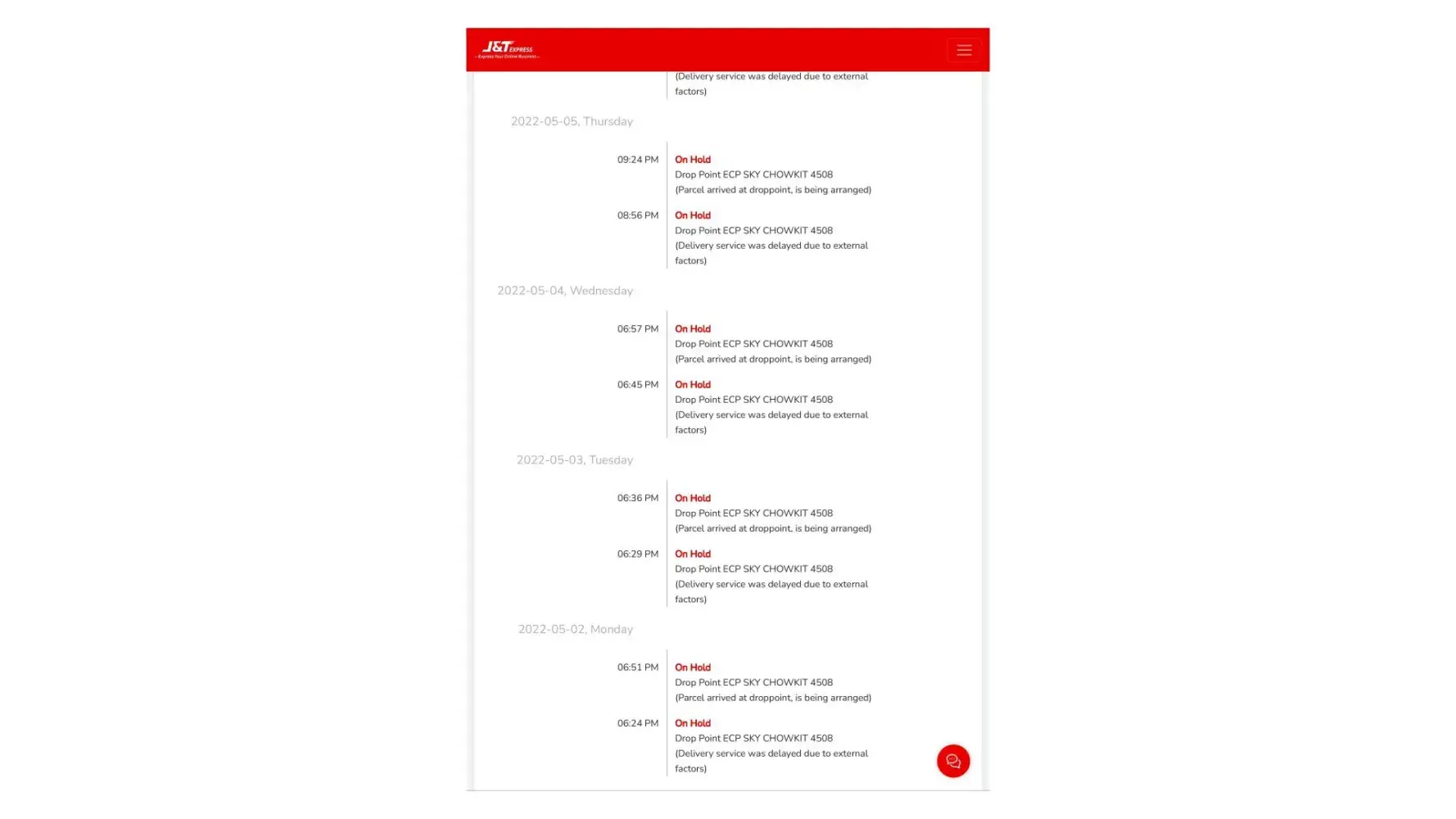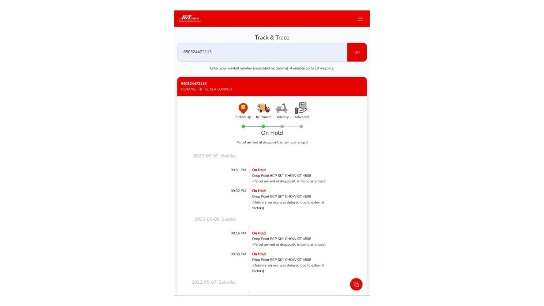 22 April 2022 - 26 April 2022 (still stuck at J&T MELAKA-GW