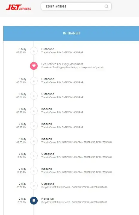 At least you got an update. My tracking update is stuck on Arrived at Sortation Centre since 28 April... Okay maybe it's Raya right? So I gave them benefits of the doubt. But now it's been more than a week. Poslaju, ninjavan and even Best have started to deliver goods since last Thursday. So clearly J&T is at fault here. I wish I could choose the courier when I order stuff, but I can't. J&T used to be so reliable and fast, but now, *sigh*. I just want to receive my order and hopefully never have to deal with them again.
