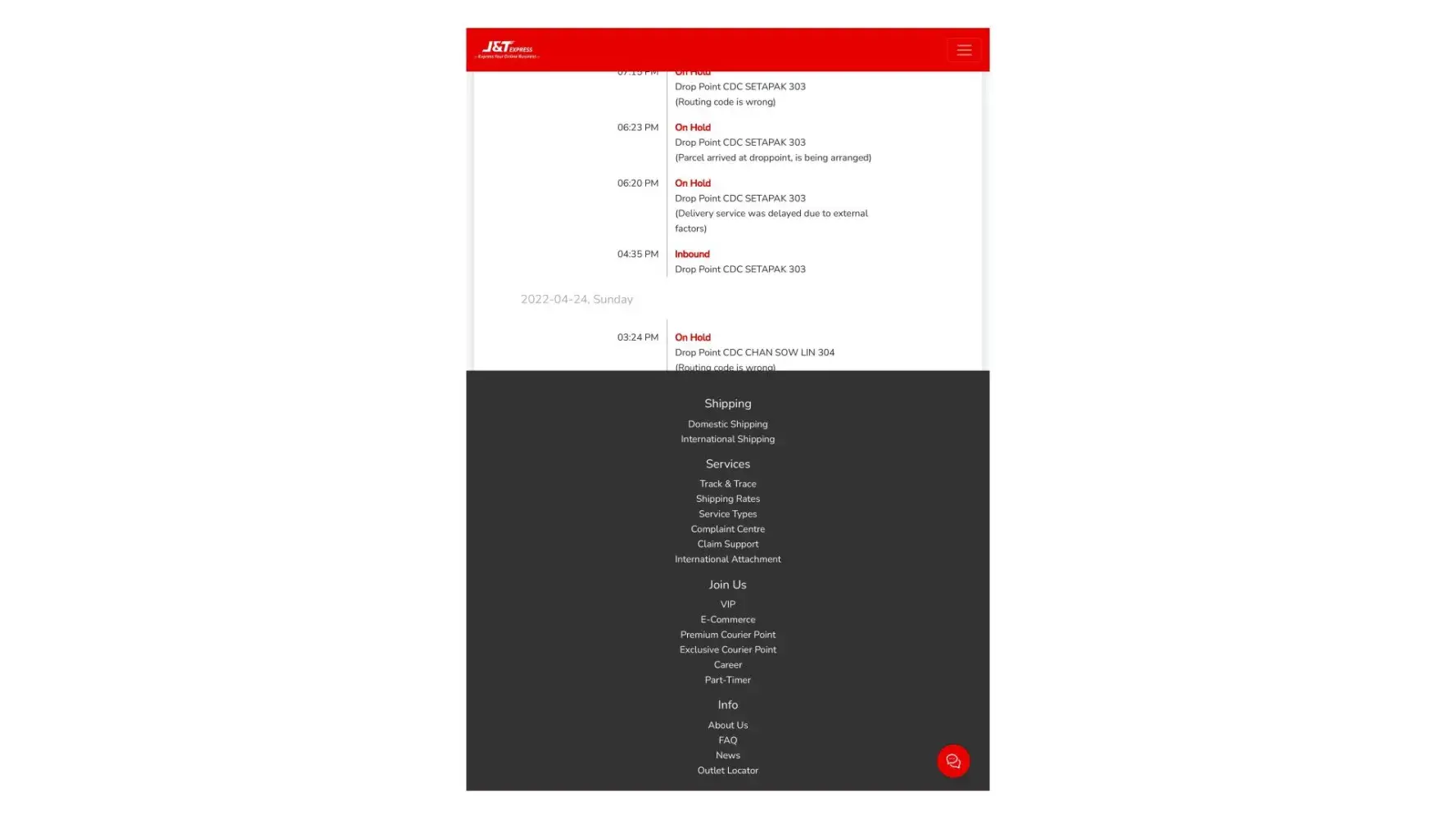 tracking number was on hold without any update since 27th April 2022 until 1st May 2022. Tracking numbers are [protected] and [protected]. has been contacted via live agent chat but very disappointed with jnt services as live chat doesn't serve the purpose as live chat as just ignored