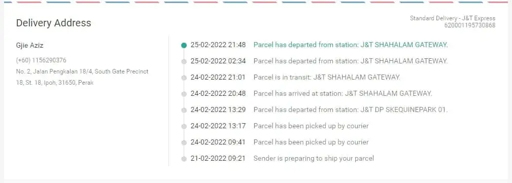 30.Januari.2022 pada pukul 10:53 am sehingga sekarang 26.Febrari 2022 tidak ada update and barang belum sampai sampai... Tolong buat kerja bagus bagus