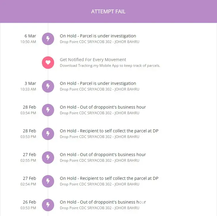I ordered something on Shopee on 25th Feb. From tracking, the item arrived at J&T CDC Senawang on 27th Feb and delivery is supposed to happen by 4th March. Today is 6th March & it still says - Parcel is in transit: J&T CDC Senawang 312.