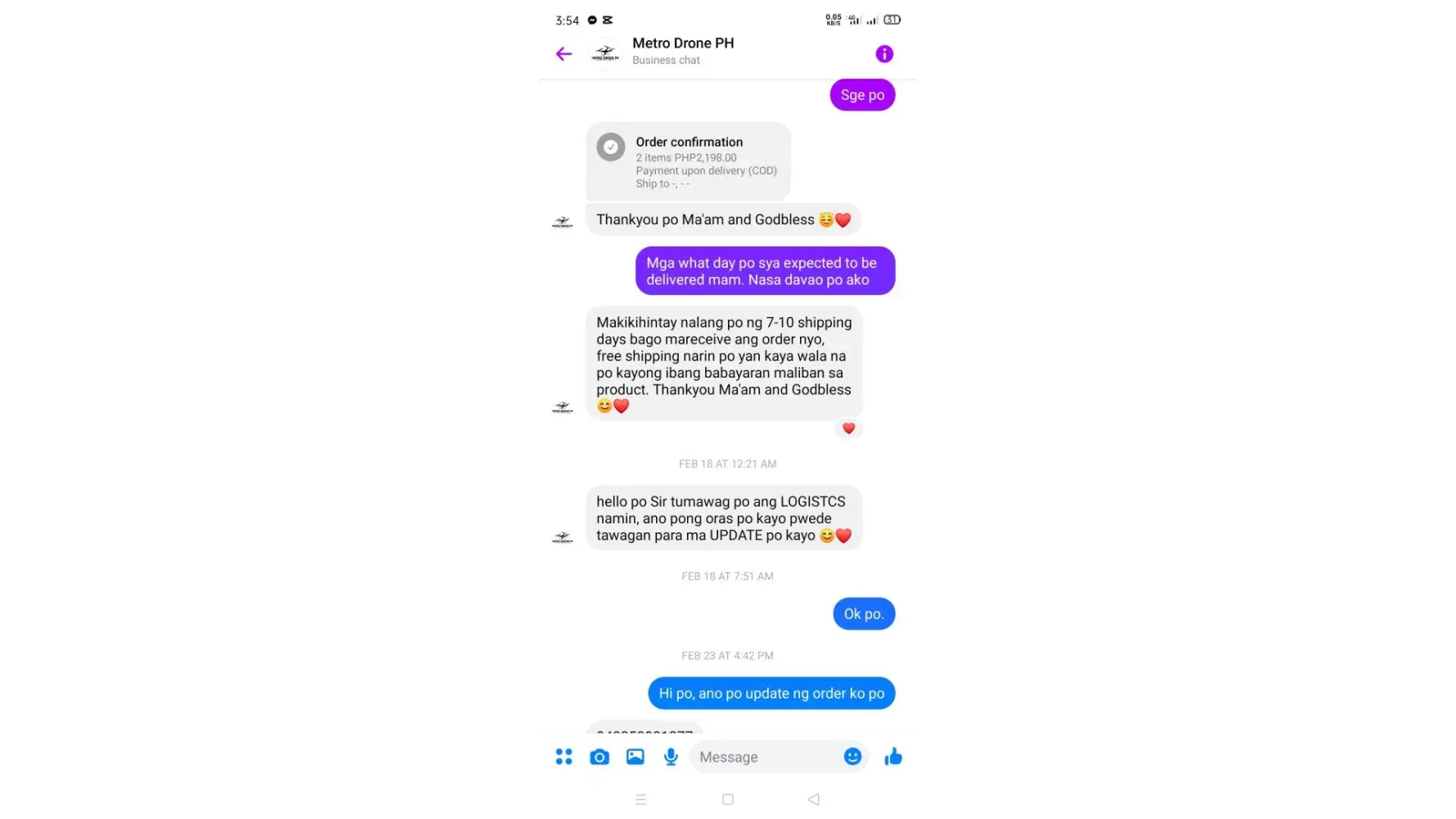 I contacted customer service 3 times (October 20, 23, 25) unfortunately no update since then. As per text message, can directly message them but no reply. (+63 [protected], [protected]). All promises from the agents.