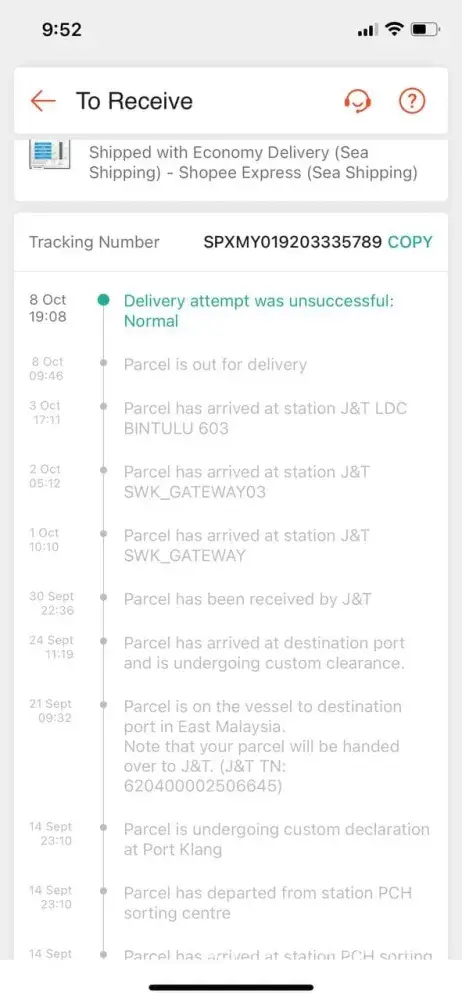 Parcel arrived at J&T LDC BINTULU 603 on 3 Oct 2021. Only try to send to me on 8 Oct 2021 but failed eventhough I was there all the time.