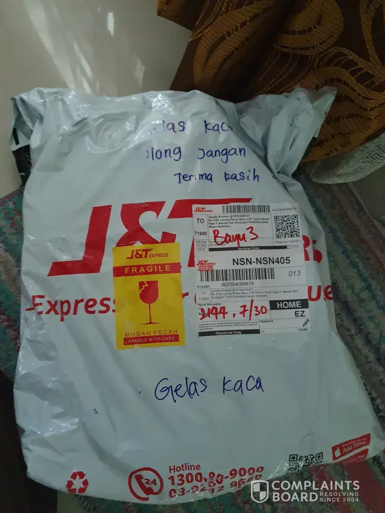 Dua kali barang diterima dalam keadaan pecah @ tidak memuaskan. Walaupun ada fragile sticker pada barang tersebut, namun staff jnt tetap tidak mempedulikannya. Saya amat kecewa dengan perkhidmatan jnt sekarang. First, penutup periuk Dessini yang dibeli pecah berkecai. Kaca2 yang ada di dalam kotak tersebut telah mencederakan saya semasa membuka bungkusan tersebut. Second, supplement juice dalam botol. Botol kemik dan bocor. Seller dah ambil langkah keselamatan semasa membungkus barangan tersebut. Namun, sekiranya staff bertindak kasar seperti melambung, membaling, menyepak barangan tersebut, absolutely barangan tersebut boleh pecah atau rosak. Please, improve your services..