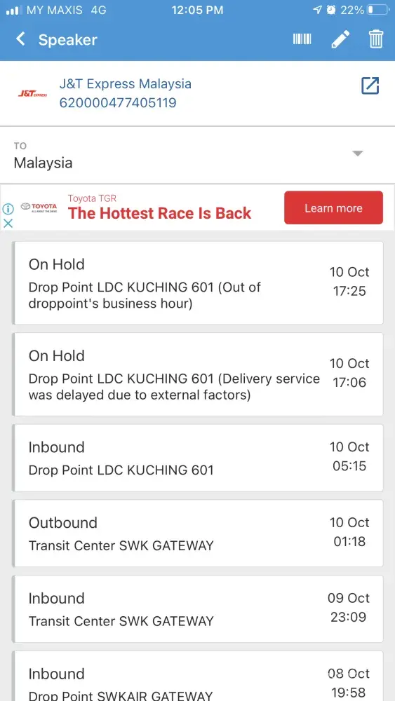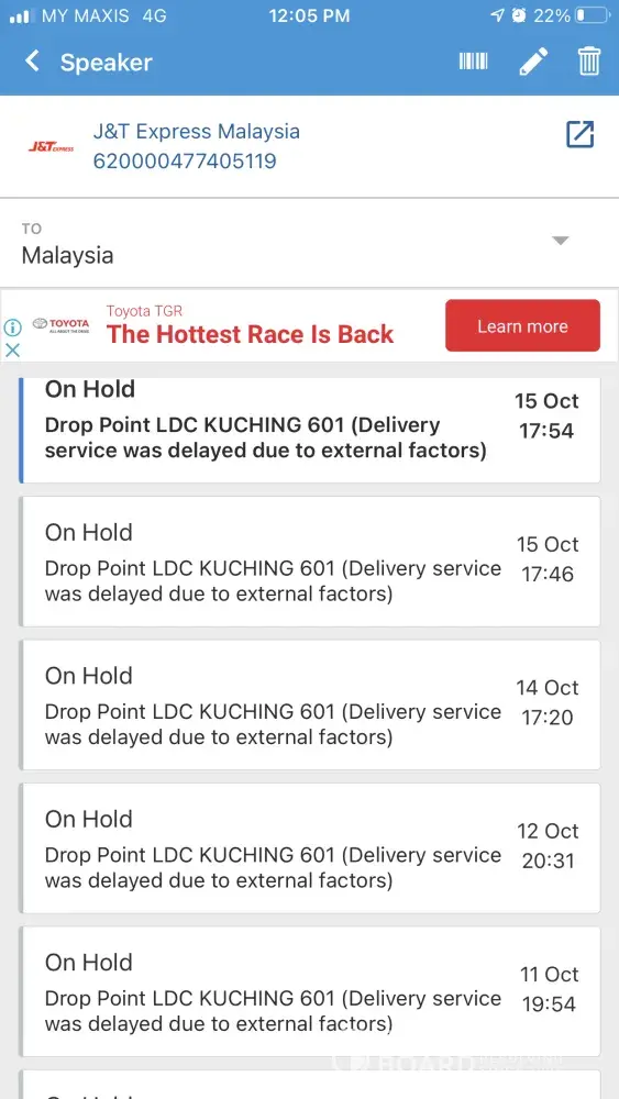 J&T Express Jnt Hub seberang perai selatan (Penang) hold parcel for 6 day and no update in system tracking