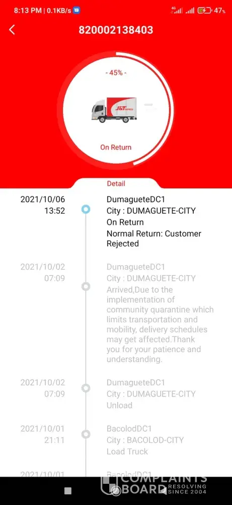 My order from Lazada with tracking number [protected] was not delivered and is now on-going return to seller. The reason explained by the local hub after I called was due to granular lockdown in the destination province, which is my address. As per the executive order mandated in my location, courier services are not suspended or affected by the granular lockdown. In addition, other courier services, ex LBC, is operating. So why is it that J&T could not deliver my parcel? The local hub did not also informed me before tagging my parcel for return, I could have just authorized someone to pick up my parcel. I have been waiting for my parcel for days to arrive but ended up being returned without information. I am supposed to use the item inside the parcel for work, how am I gonna work without my parcel delivered? I have called two J&T local hubs but there is no solution to my problem when in the first place it is their fault.