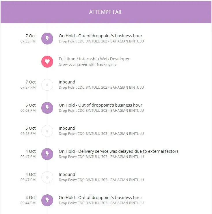 My parcel still on hold at J&T Bintulu for 4 days reason attempt failed, the service of J&T getting worst, parcel no. [protected]