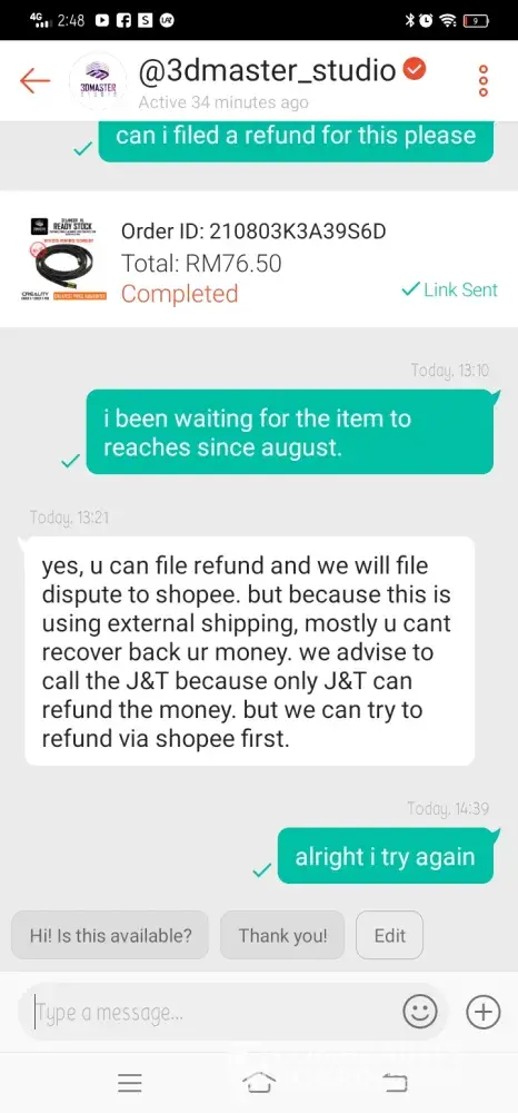 We have been going back and forth with the staff of J&T for feedback, but we are always awaiting feedback from J&T Negeri Sembilan for the parcel, but they never helped us to look for the parcel.