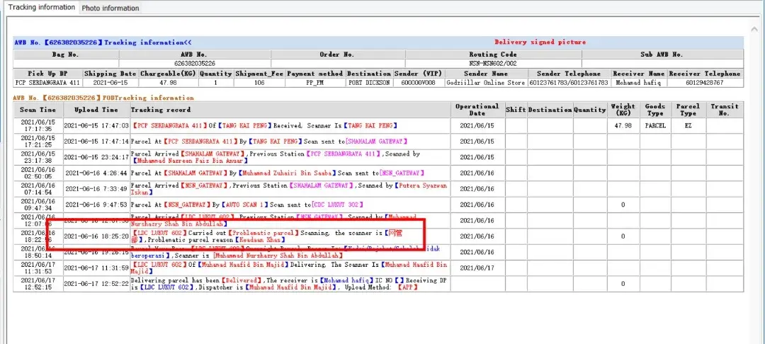 So I checked with one of the staff in J&T and asked her to help us to check if the parcel was delivered to the customer. The staff checked and said that there are two parcels with the same airway bill, and so J&T Negeri Sembilan chose to deliver one of them (Item #2) and keep the other parcel (Item #1) back at J&T hub.