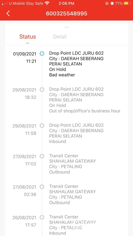 My parcel was on hold because of the bad weather? 6 days already and still stuck at J&T JURU 602. Please send my parcel as fast as your company can. I think, this problem came from J&T rider that dont want to deliver my parcel at the adress stated then give a stupid reason because of the bad weather. J&T please take note and ask your company rider at J&T JURU 602 to send my parcel. Really bad service! Thank You.