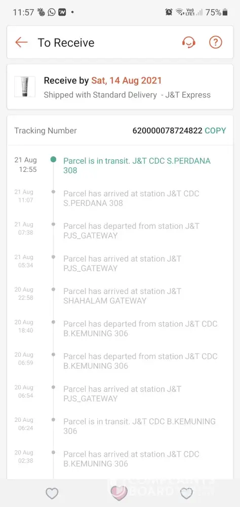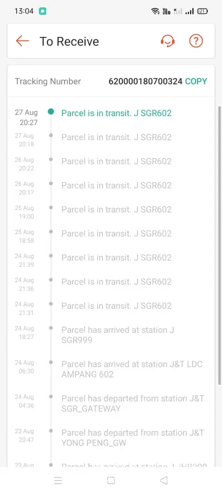 Delivery status still not updated since 20 August. Barang tersebut telah di hantar pada 13 August dan sehingga kini masih belum diterima. Sudah melebihi 2 minggu barang tersebut sama masih belum terima. Barang tersebut telah tersangkut lama di SBH_GATEWAY sehingga kini masih belum di update oleh pihak j&t. Saya berharap agar pihak j&t dapat memberi perhatian terhadap barang ini dan segera menghantarnya