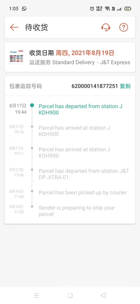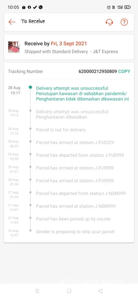 8.8 beli barang, sampai 29.8 pun belum sampai, alasan yang diberi ialah kes covid, tetapi barang lain yang bukan pakai J&T dah sampai selepas 3 hari. Katakan station di Klebang menghadapi sanitiz barangan, perluke ambil masa sehingga begitu lama? Kecewa sangat tindakan yang diambil oleh J&T, harap kedai2 shopee jangan lagi deal dengan shopee, ingin sangat batalkan pembelian sahaja...
