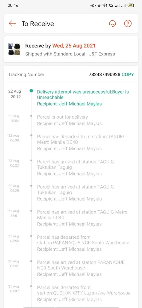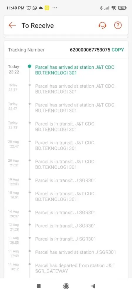 di atas adalah dua no tracking saya pada penerima yang sama. dari 12/8/2021 sehingga hari ni 23/08/2021 masih tidak sampai kepada penerima. saya sudah membhat oanggilan kepada customer servise pada hari jumaat. tapi masih lagi tidak sampai kepada penerima. saya harap jnt tolang buat sesuatu. saya akan mengalami kerugian membayar ganti rugi jika customer membatalkan pembelian.. sila hubungi saya [protected]-nurul alifa