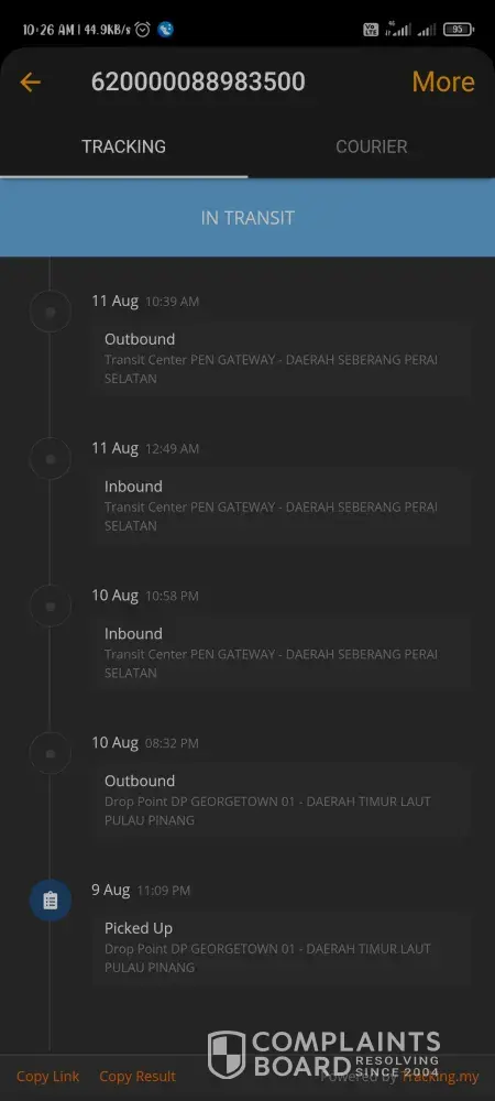 Hai.. Saya minta maaf kerana mengadu. Tetapi perkhidmatan anda terlalu lambat.. Saya menunggu bungkusan saya dari 11/8/2021.. Ni sepatutnya tiba lebih awal tetapi saya tidak tahu apa masalahnya kerana ia tersekat di center prk gateway 900 - larut matang hingga kini...