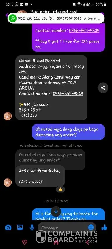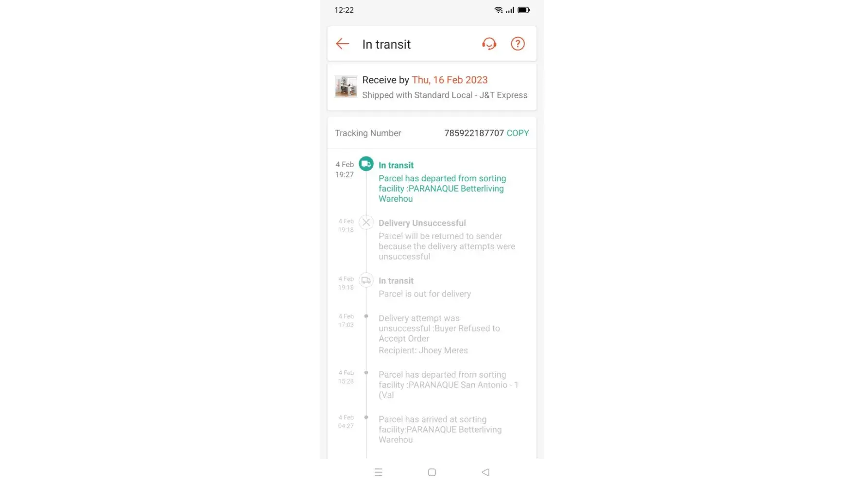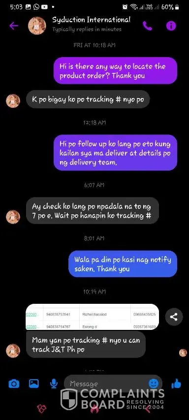 Hi I would like to complaint regarding for NO NOTIFICATION RECEIVED from the courier. This was the second time that I order with J&T partners for delivery and I was absolutely upset due to this unacceptable reason. I order to Syduction International last February 6, 2023 at 9:18am and place my order same day at 9:29pm. I do also, ask the coordinator for how many days for the deliveries arrival and answer me 2 - 5 days upon placing of order. I keep waiting and asking for trucking number for me to be able to locate my order and only to find out that my order was unsuccessful due to the customer is not around. My first encounter was the same reason and I felt being disadvantage because I need to pay for the cancellation fee without receiving any notification from your team and obligated to pay for them not to post my picture with accusation as a FRAUD. Hoping for your investigation and acceptable answer with this. You may reach me thru below details:
