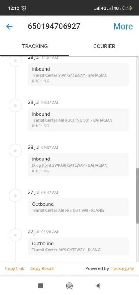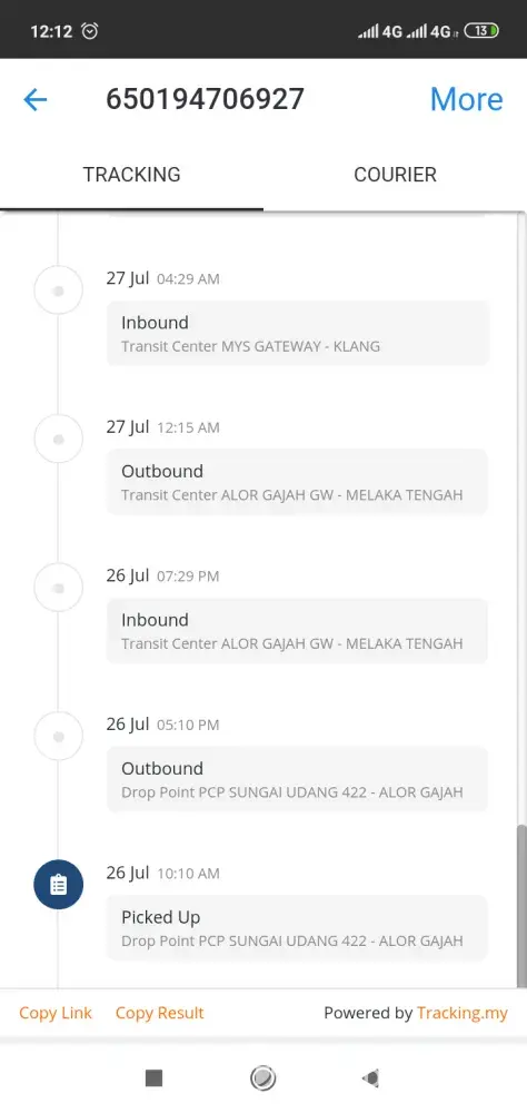 13/7/2021 I'm using your service as usual by shipping 35.93kg parcel from Penang to KL.