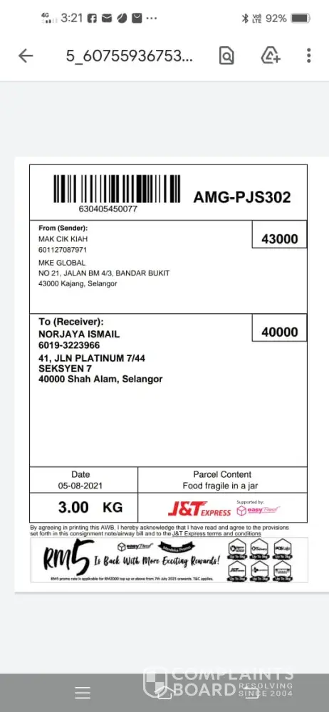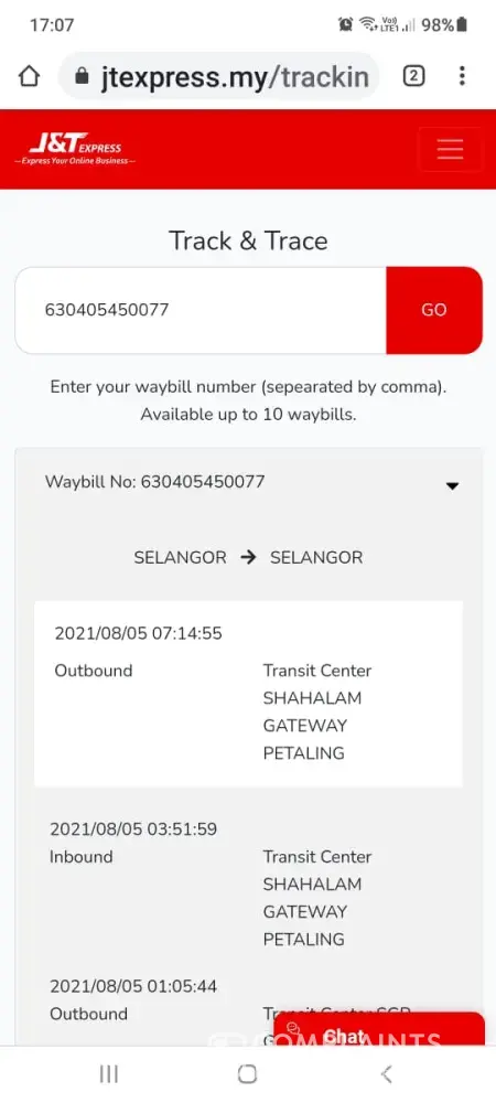 I was buy some product from Halomobile Ampang Kuala Lumpur on 31th July 2021. The shop told me that JNT as my courier deliver and they promises my items will be reach at 2/3 working hours.