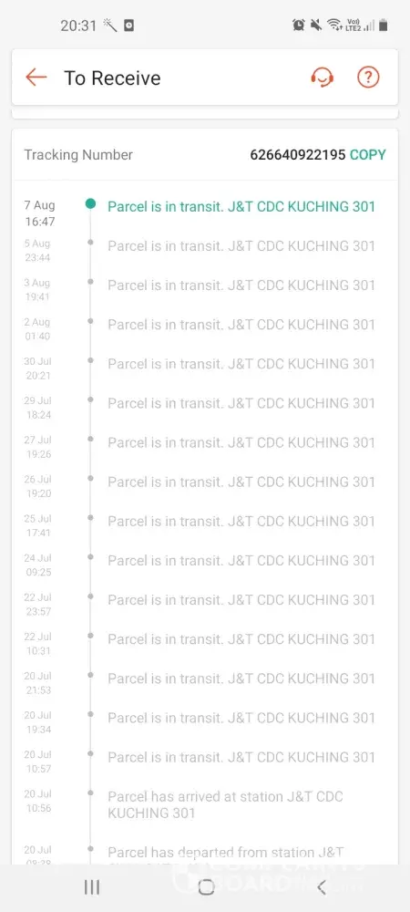 I wait too Long for my parcel, just now seller form shopee advice me to make a call ask the warehouse I called but they did not answer..my parcel arrive there at 31/7 and until now 8/8 the tracking only show in transit..really dissapointed with J&T AIR KOTA KINABALU 501 service always like this.. Tp barang selepas tu boleh pla sampai dulu.. Penat wei balik2 nk kol korang.. Always call ended.. this all working under shopee progress, if I can choose what type courier service I want, I will not choose J&T service. Thank you