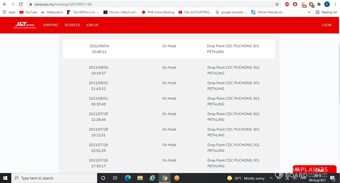 25/07/2021 until 06//08/2021 my parcel still on hold at Puchong