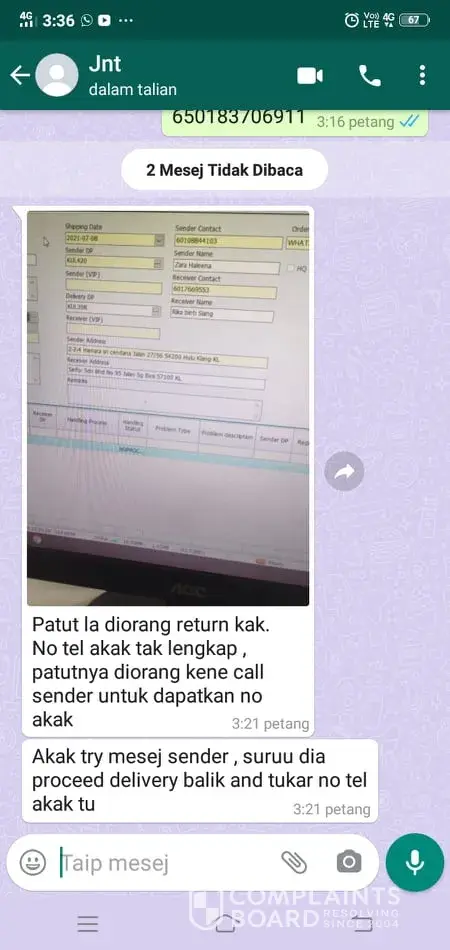 Kenapa barang mak saya berpatah balik, sedangkan j&t part time kt bawah rumah tak naik, then dia ckp gagal contact number? Sedangkan fon sentiasa kat tangan . Dah Lama tunggu2 . On hold berhari2 . last berpatah balik . Tolong hantarr semula ye . No tracking [protected] . Contact saya [protected]
