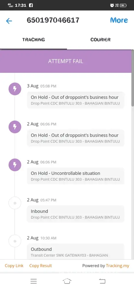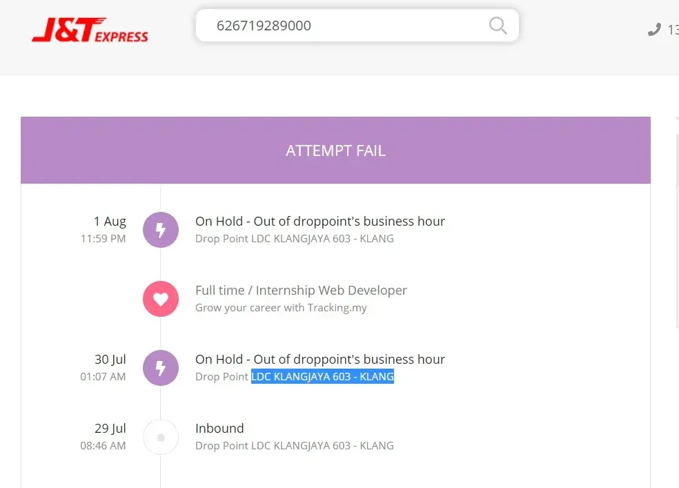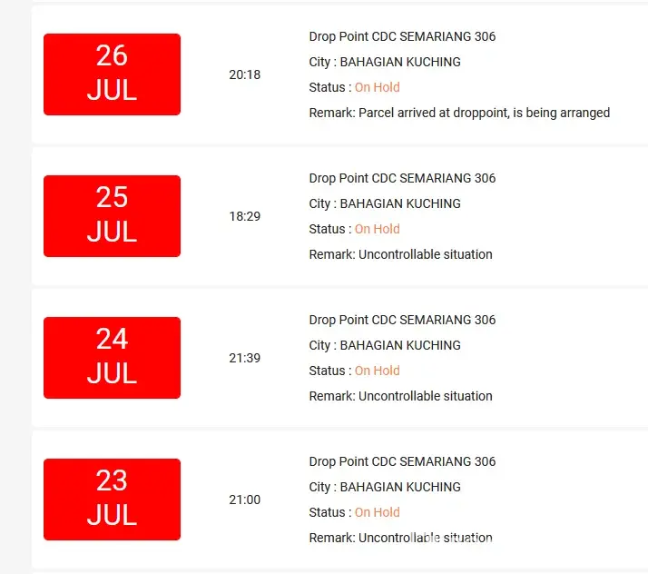I had on two occassions at least where parcels were stuck at Cyberjaya Drop point for two days or more.