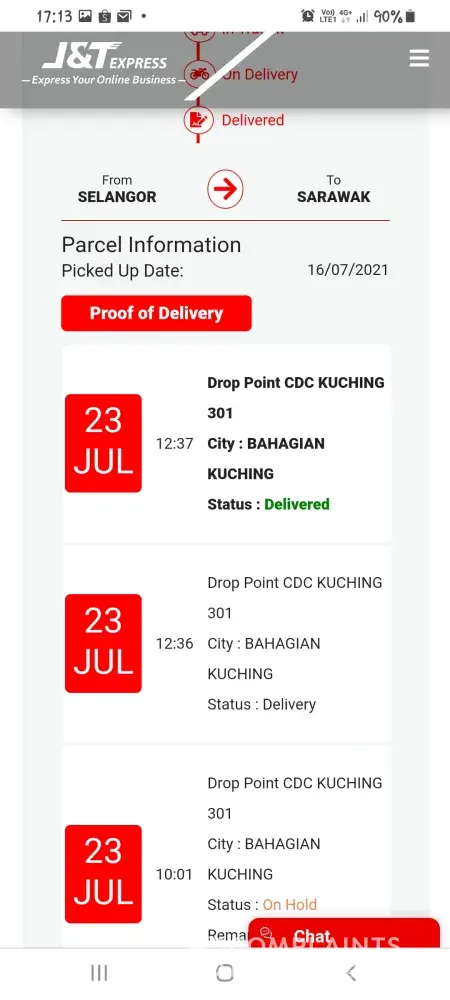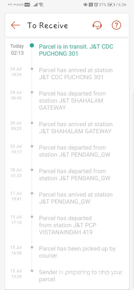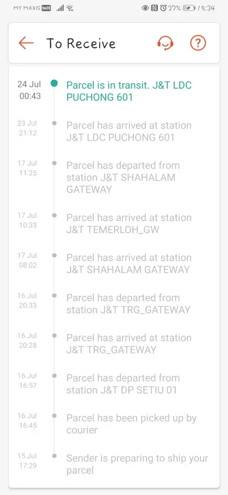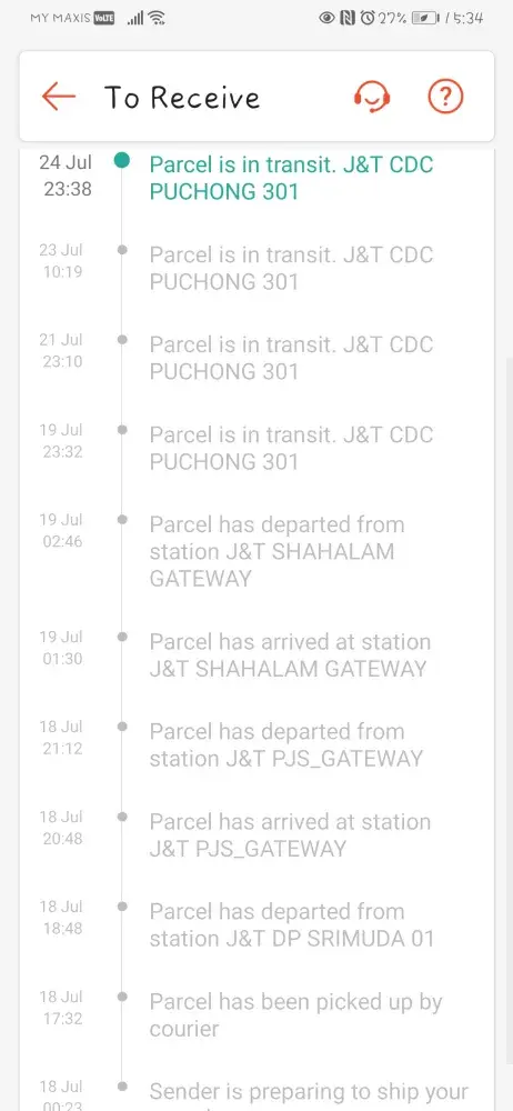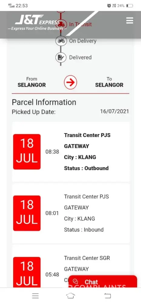 Stuck atau hilang sangkut at jnt transit center pjs gateway klang city on 18 julai 2021 at 8.38am
