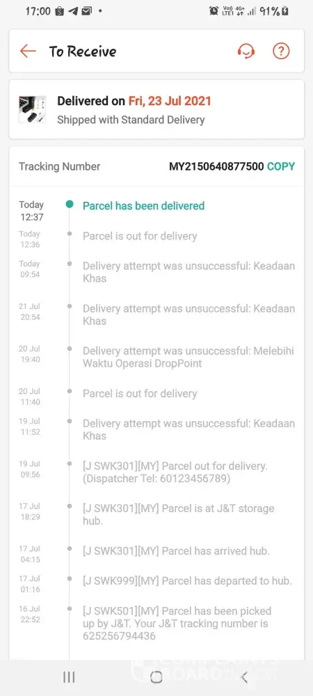 I has checked my parcel tracking ([protected]) and base on J&T record my parcel has been delivered on 23 July 2021 but until now i didnt receive the parcel yet.How come on J&T record the status is delivered eventhough i have not receive the parcel. I try to contact the hp no of despatcher that has given in the record of tracking but no answer. Please trace and delivery my parcel.