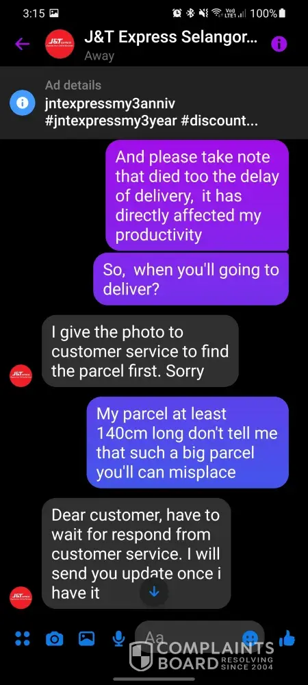 I have purchase a writing desk through Shopee on 14th July 2021 night and J&T has collect the said parcel on 15th July 2021 from the seller. Tracking system show that the parcel has reach J&T PJS 998 on 16th July 2021 and it don't have any update until now. Try to contact J&T with they live chat numerous times but no 1 respond to my enquiry. Call them they all me to seemed whatapps, and when I send whatapps they want me to request refund. No 1 is try to solving the problem at all. At the end manage to contact their facebook page admin and the admin request the parcel packing photo from seller. I've suspect they have lost my parcel. Cause they say have to check their CCTV to find my parcel.