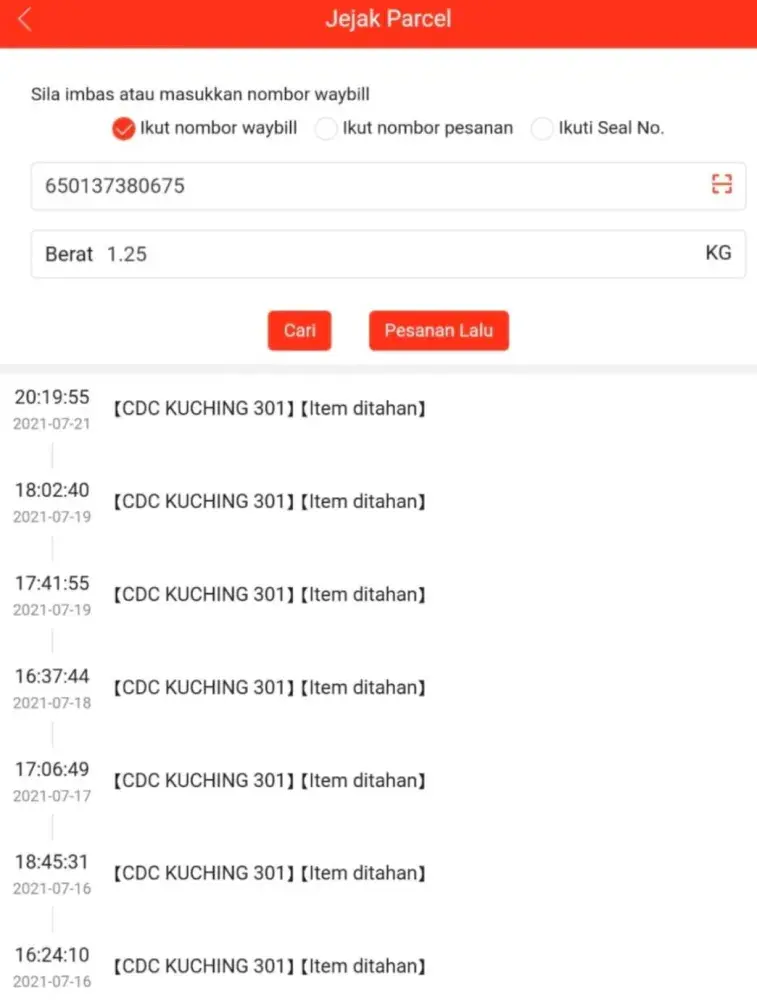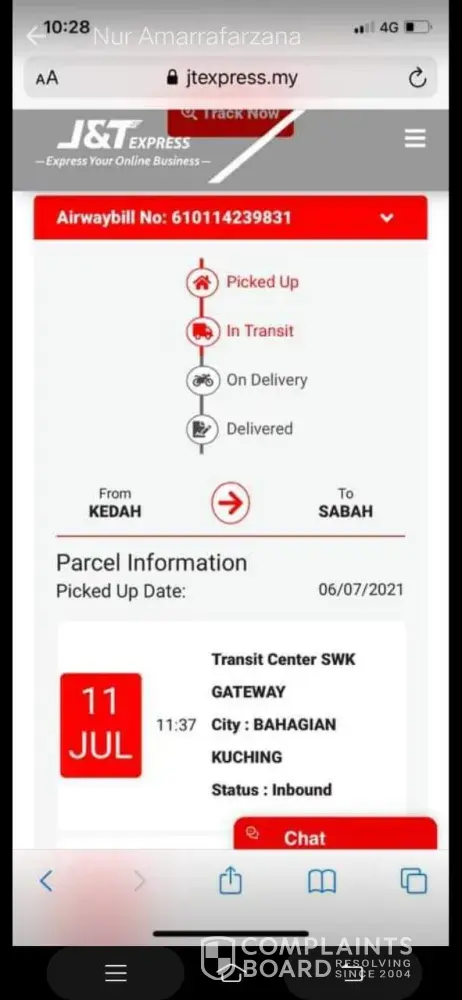 parcel dipos bernombor [protected] pada 16/04/2021 melalui Jnt Express Kota Tinggi, Johor ke Kuching Sarawak tetapi sampai sekarang barang tidak di terima oleh penerima. sudah 3 bulan 7 hari. saya semak dalam sistem J&T barang tersebut ada dekat gudang CDC Kuching 301, Sarawak. saya sudah menghubungi J&T customer service beberapa kali dan memaklumkan kepada mereka dan mereka mengatakan barang ada di scan dan out untuk delivery dan jawapan itu adalah jawapan yang sama setiap kali saya mengubungi dan bertanyakan tentang barang saya. tetapi tidak dihantar juga. saya cuba menghubungi pihak J&T CDC Kuching 301, tetapi tidak ada maklum balas dan panggilan tidak dijawab. jadi sekarang saya tidak tahu status sebenar barang saya sama ada masih ada dekat gudang atau tidak. saya semak CDC Kuching 301 dalam google banyak sangat komen negatif. saya harap pihak J&T Express Kuching 301 akn lebih bertanggunhjawab dan amanah melalukan kerja. barang pemilik adalah hak pemilik dan pemilik berhak menuntut semula.saya harap pihak tuan/puan memandang serius dengan situasi dan tindakan harus diambil. sekian terima kasih.