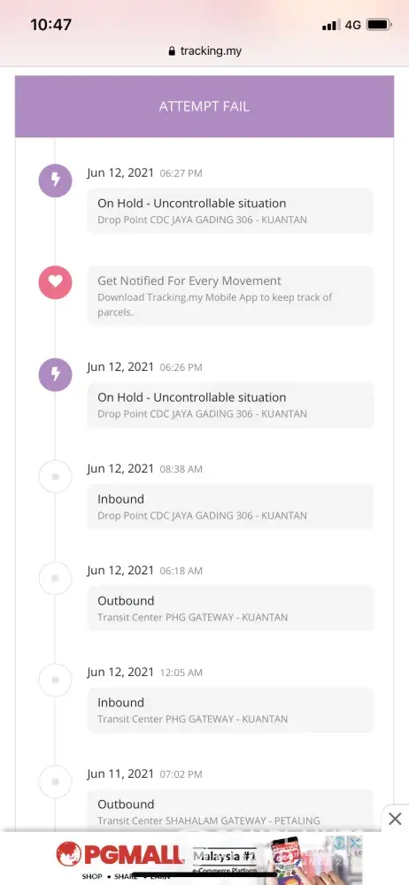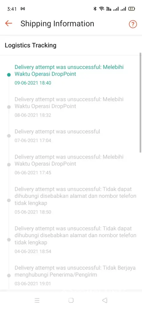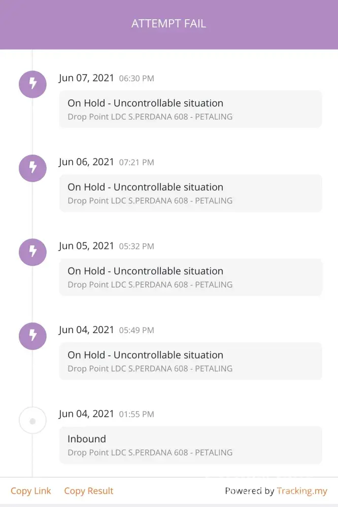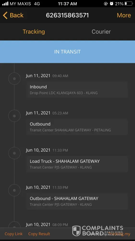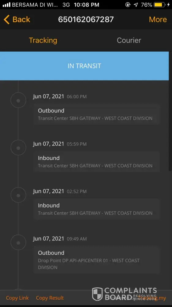 Saya masih belum menerima barang yang telah dihantar pada 21 April 2021 sehingga hari ini11 Jun 2021. Dalam sistem barang hilang di Kota Kinabalu. Mohon untuk tindakan siasatan segera. Terima kasih.