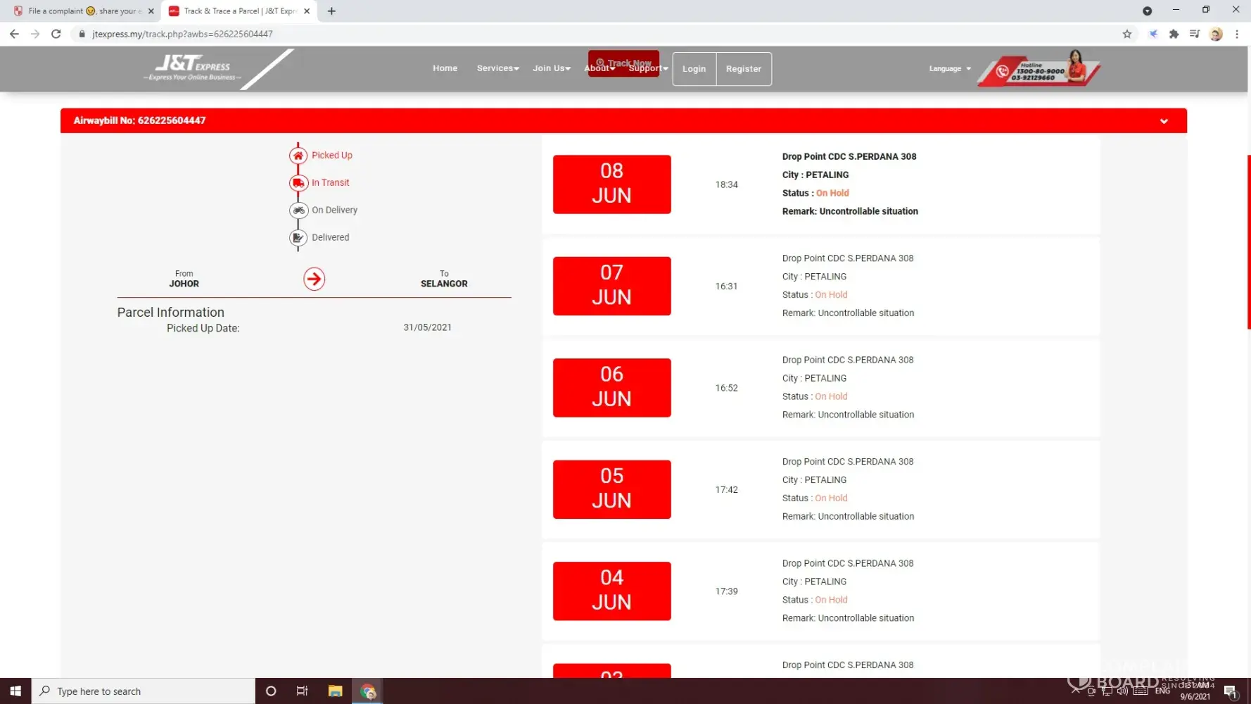 I am a shopee seller, I sent my parcel on 31/5/2021, but until today my customer not received the parcel. My parcel has been ON HOLD for 10 days since 2/6/2021 . Tracking no.[protected].