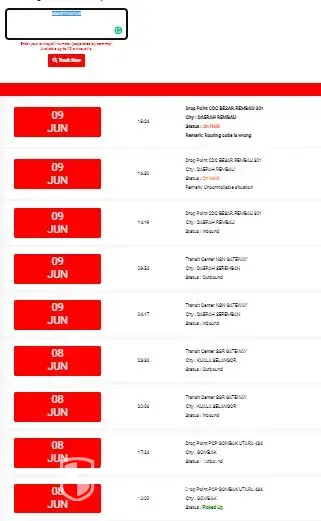 Barang saya sampai di jnt krubong 308 pada 8.6.2021 tapi sampai sekarang tidak delivery. Sedangkan barang saya yang sampai kemudian pun da dapat. Saya perlukan barang saya segera. Saya da whatsapp saya da call tapi tidak di balas. Saya faham banyak barang tapi da seminggu. Barang saya yang kemudian sampai di krubong 308 pun da delivery.. Tapi yang ni sampai dulu pun tak delivery lagi.. Whyyyy!
