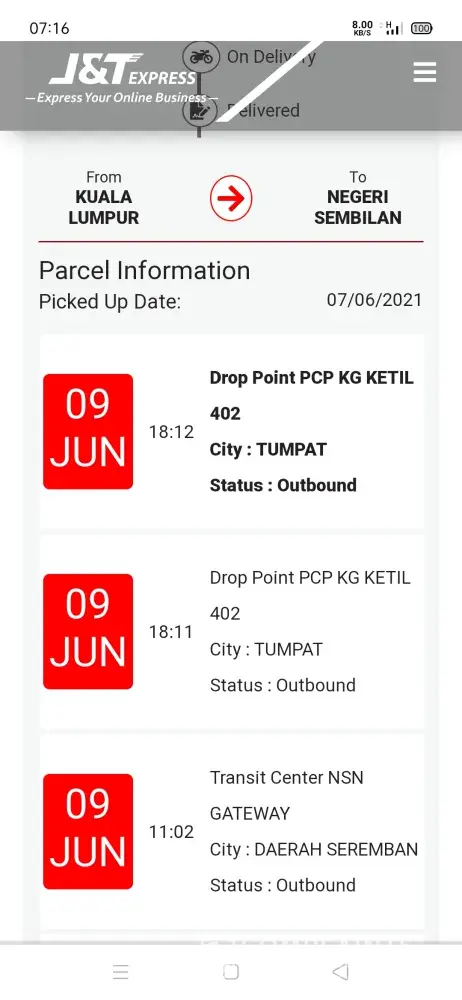 Respon jnt why my parcel pergi Ker Kelantan.sepatutnya 3&4ary dah Smpai.alamat d negeri sembilan sahaja